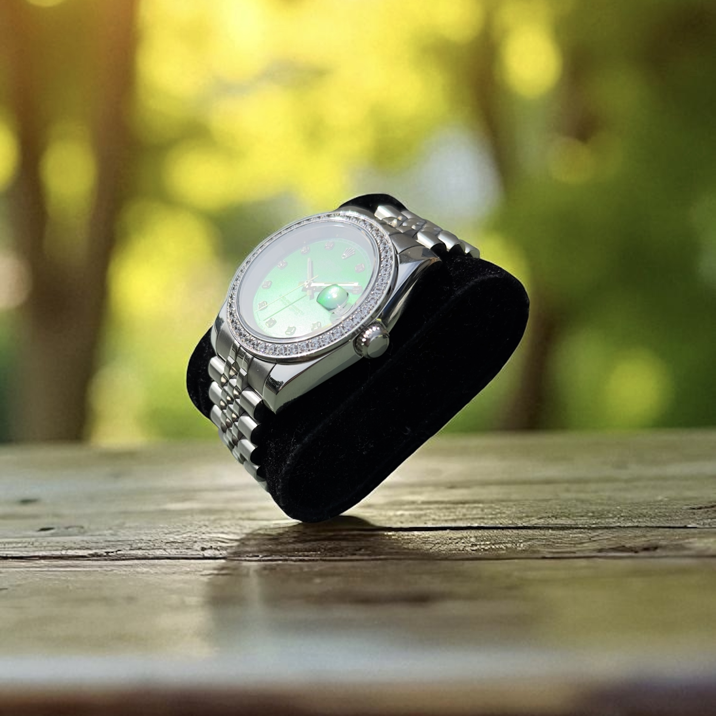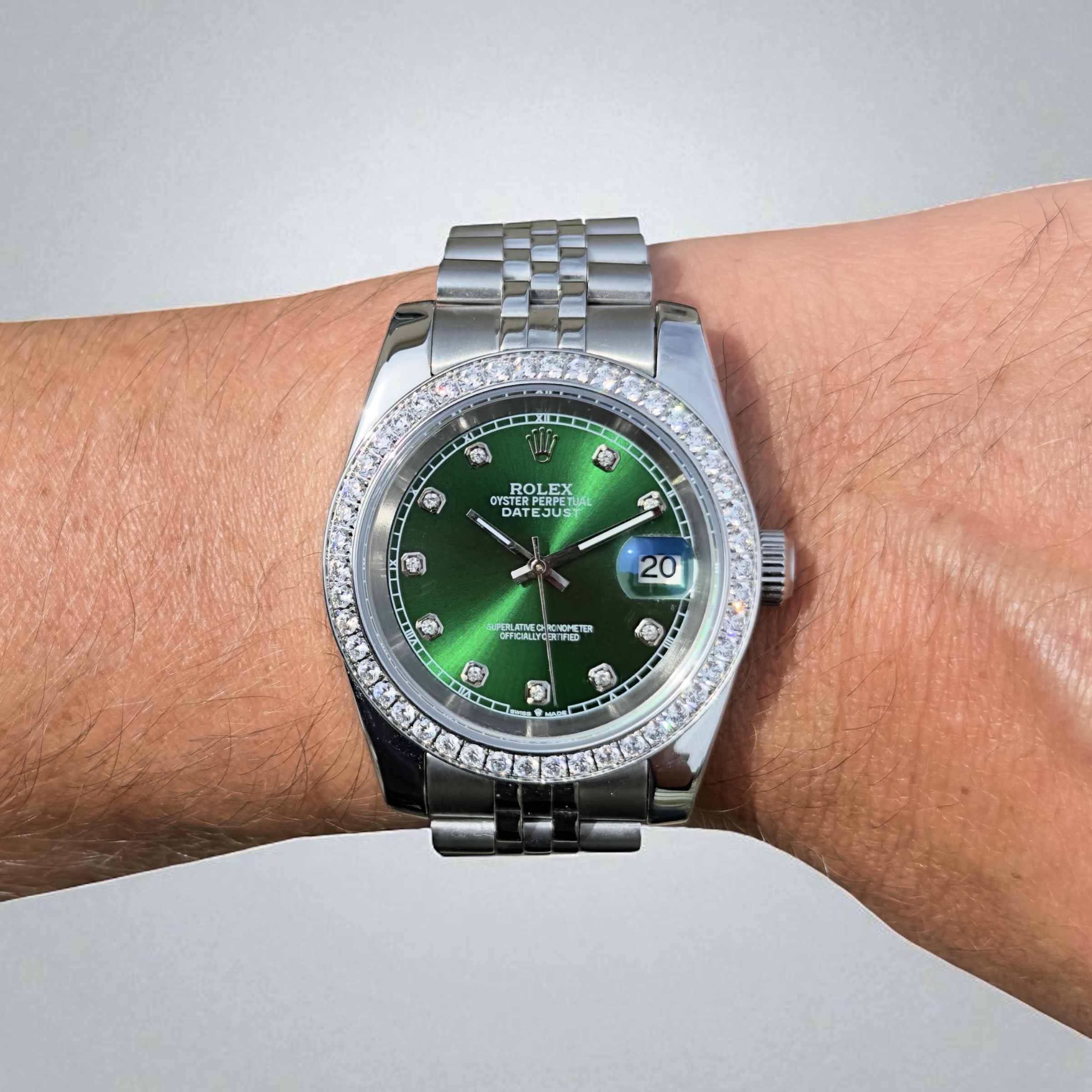 Boitier en acier inoxydable plein avec lunette serti oxyde de zirconium et bracelet acier inoxydable.