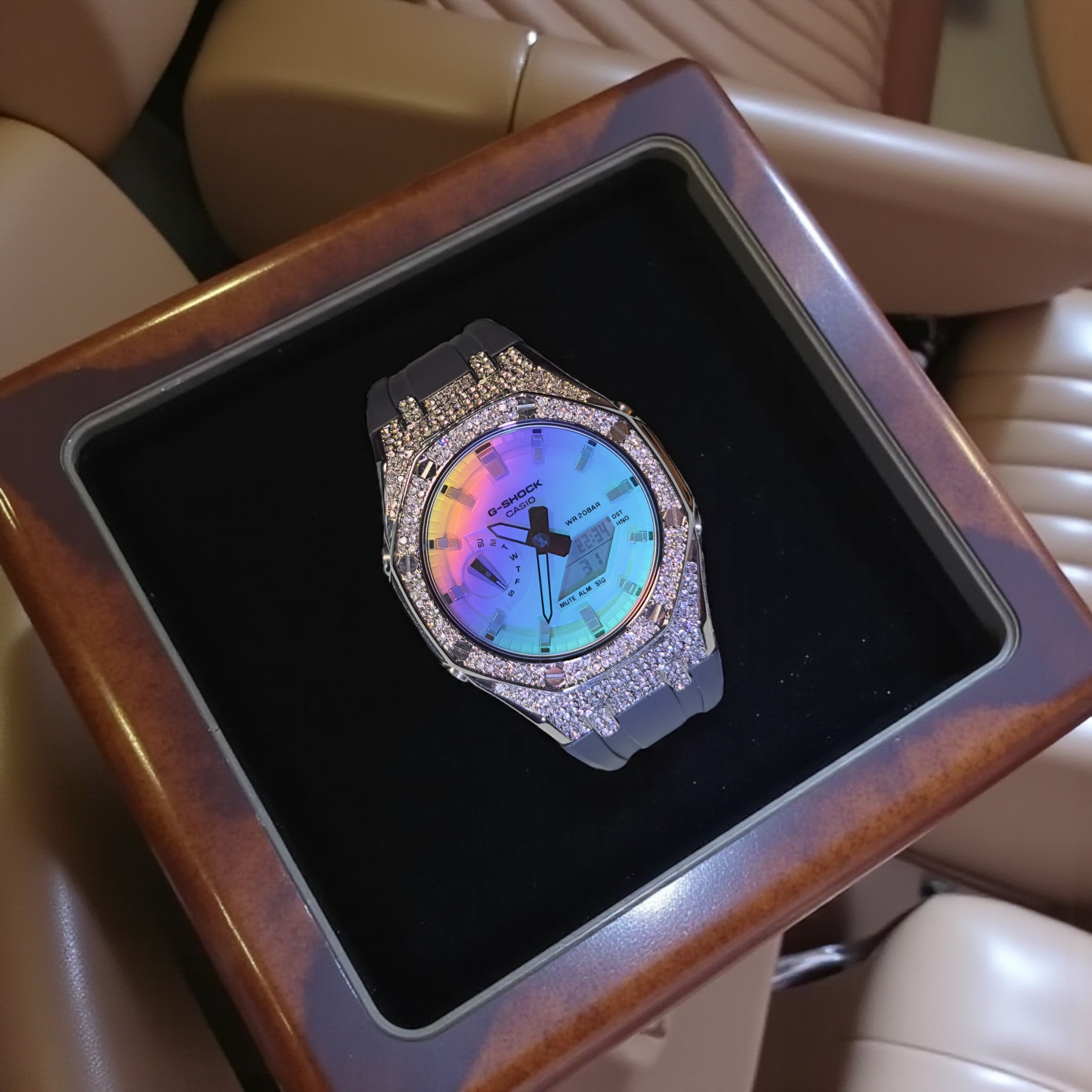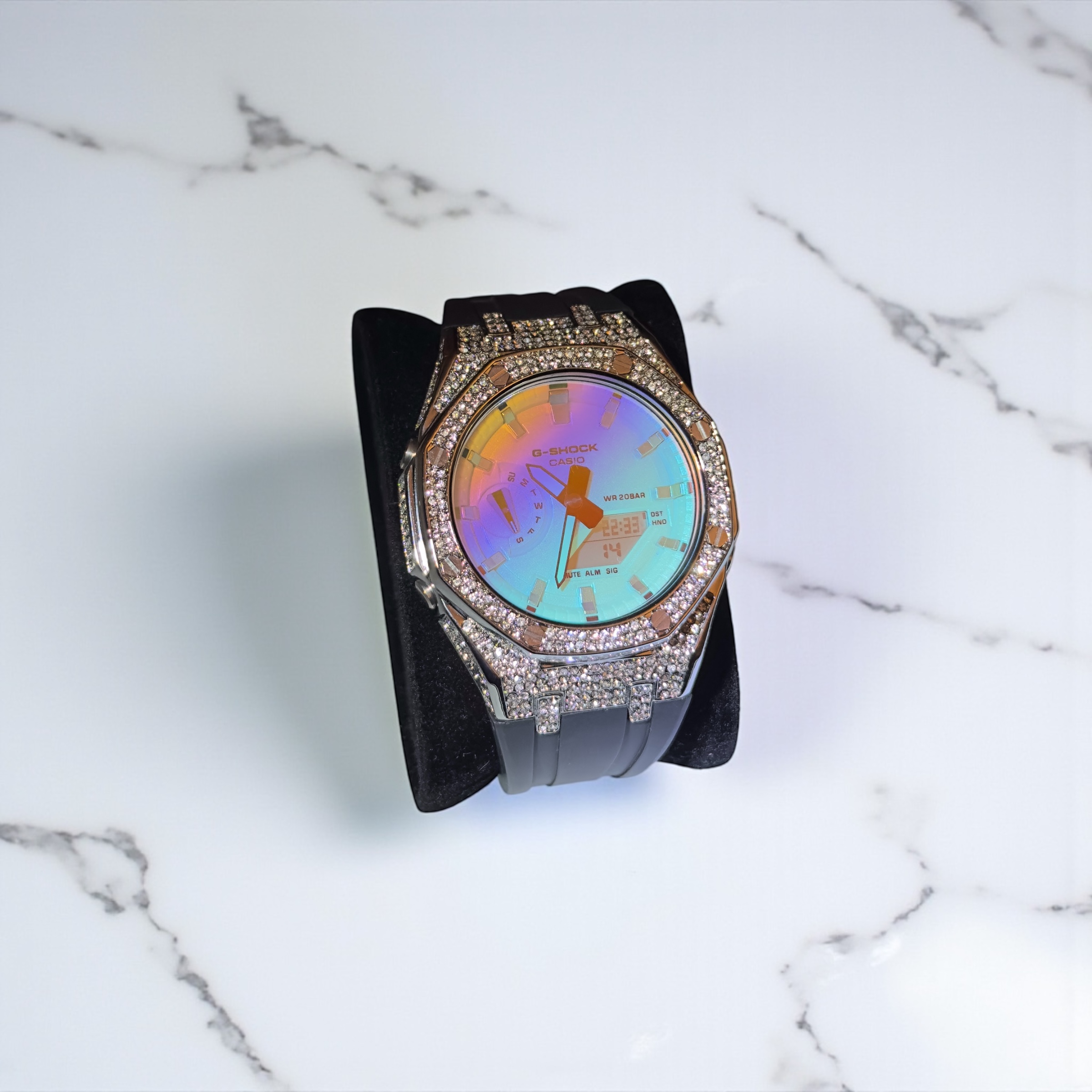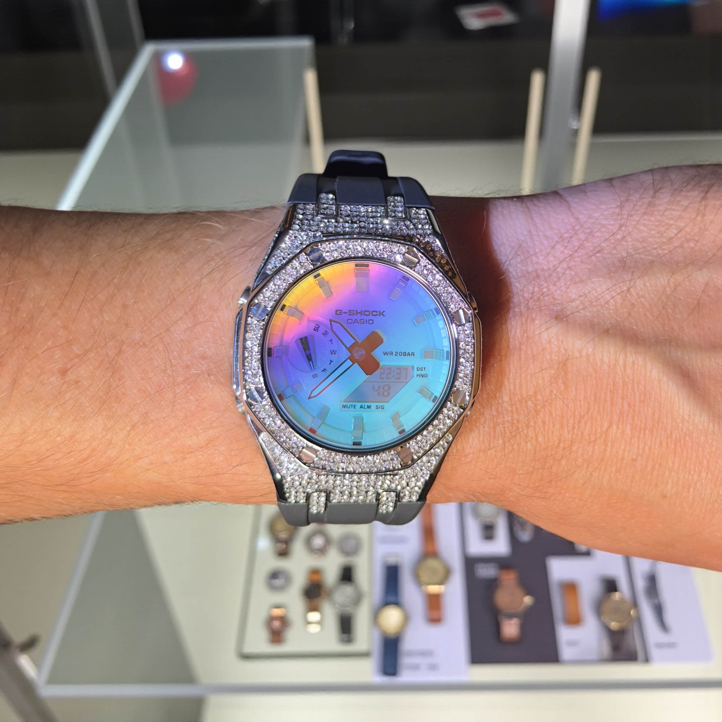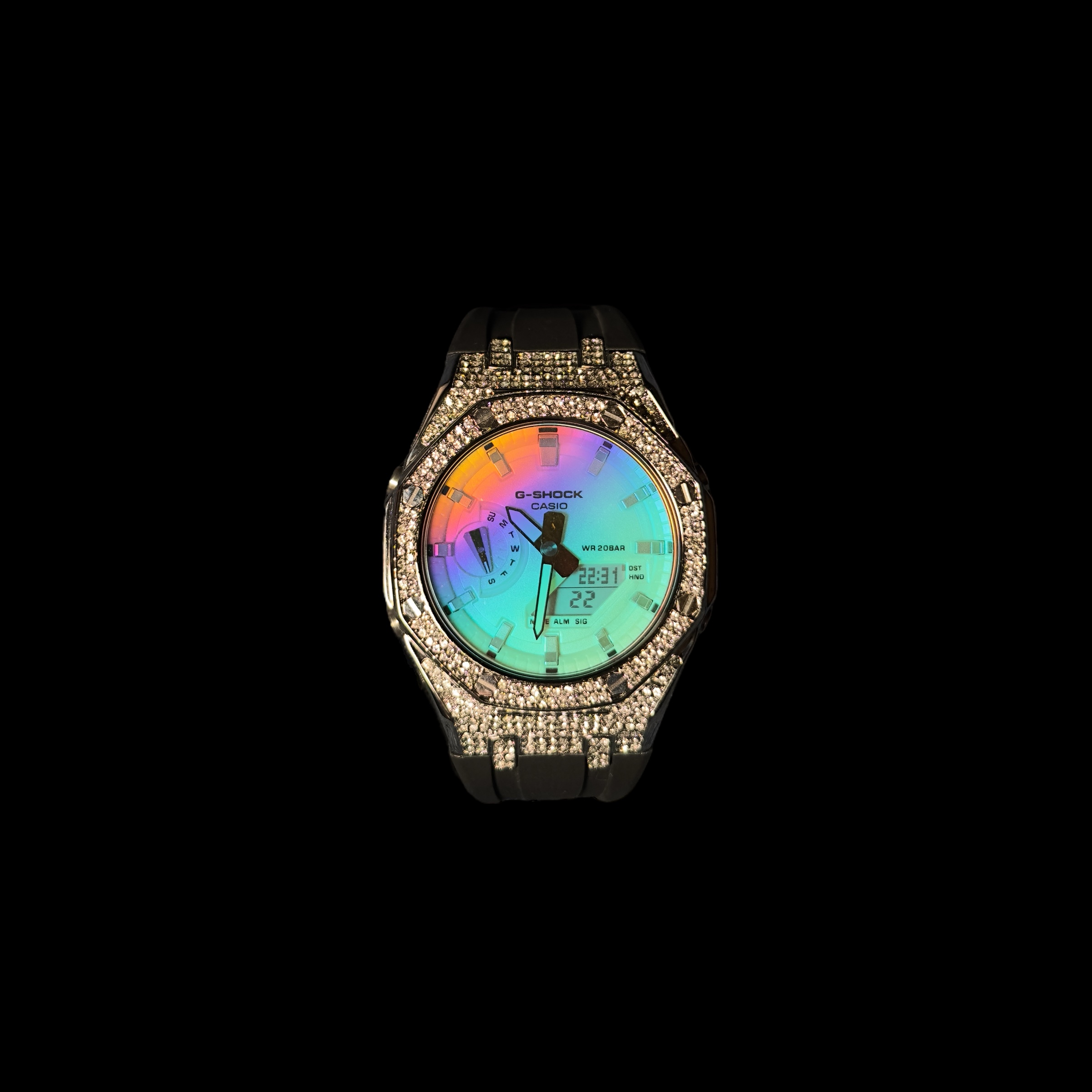 Montre G-Shock GA-2100 en série limitée customisée avec un bracelet caoutchouc noir et boitier plaqué or 18K sertie d’oxyde rose.