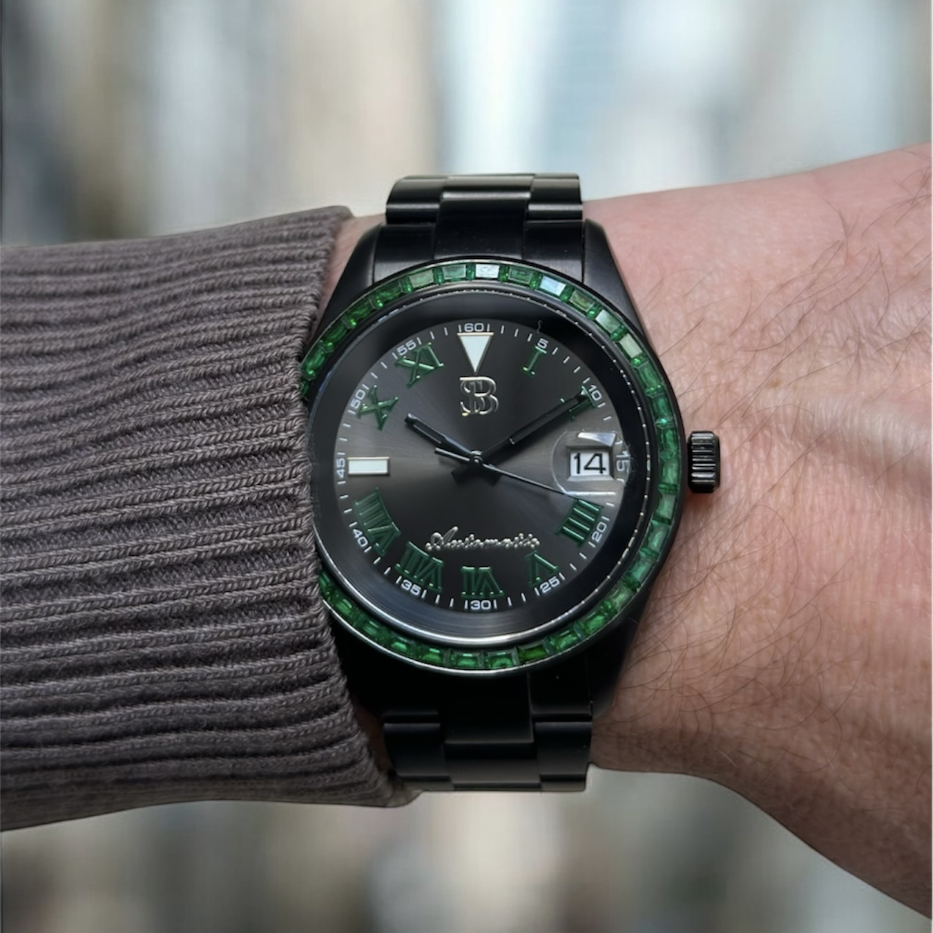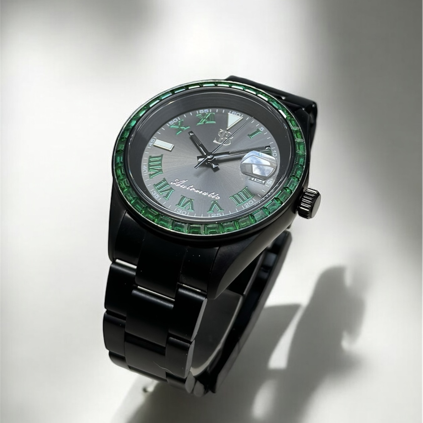 Boitier en acier inoxydable plein avec lunette serti oxyde de zirconium et bracelet acier inoxydable.